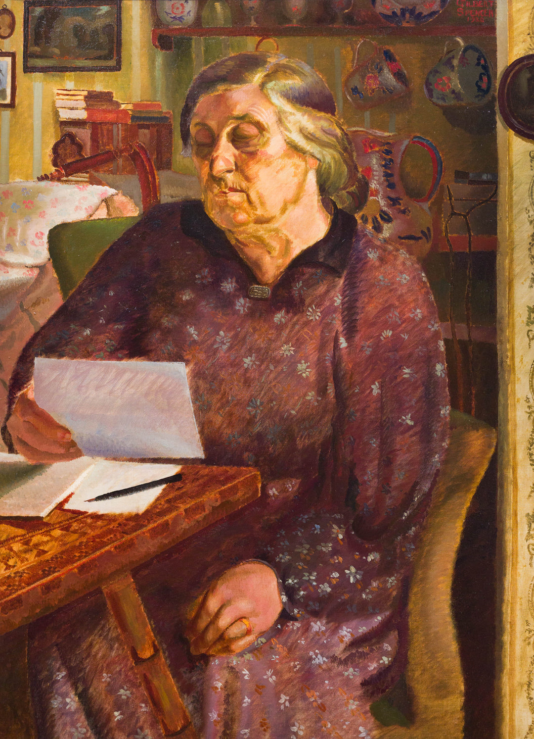 Portraits in oils did not comprise a large proportion of Gilbert Spencer’s output, with around fifty known works. Nevertheless, he kept up a steady production of portraits of friends, family, the occasional commission, and an ongoing series of self-portraits. In the early years of his artistic development, portraits provided an opportunity to experiment with form and colour. They also give a sense of Gilbert’s interest in his subjects. Most of his sitters were known personally to him, and his portraits often convey the warmth of their relationship, as well as the sitter’s personality.