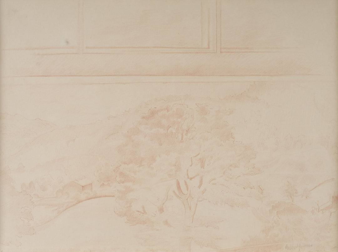 Landscapes make up by far the greatest part of Gilbert Spencer’s output, and are the genre for which he is best known. He was no seeker of the Sublime, preferring the gentler landscapes of the southern English counties, where he lived for most of his life. Indeed, when Spencer was evacuated to Grasmere with the Royal College of Art in 1940, he struggled to adapt to the dramatic Lake District scenery, admitting that he ‘never came to terms with the mountains, and treated them as sky’. His tranquil English landscapes were part of an inter-war current of neo-romanticism (see Alexandra Harris, Romantic Moderns, London, 2010), whose fellow travellers included Spencer’s close friend John Nash and his brother Paul Nash, Eric Ravilious, and John Piper. In composition and technique, however, Spencer’s landscapes owe as much to Camille Pissarro and Paul Cézanne as they do to his English peers.