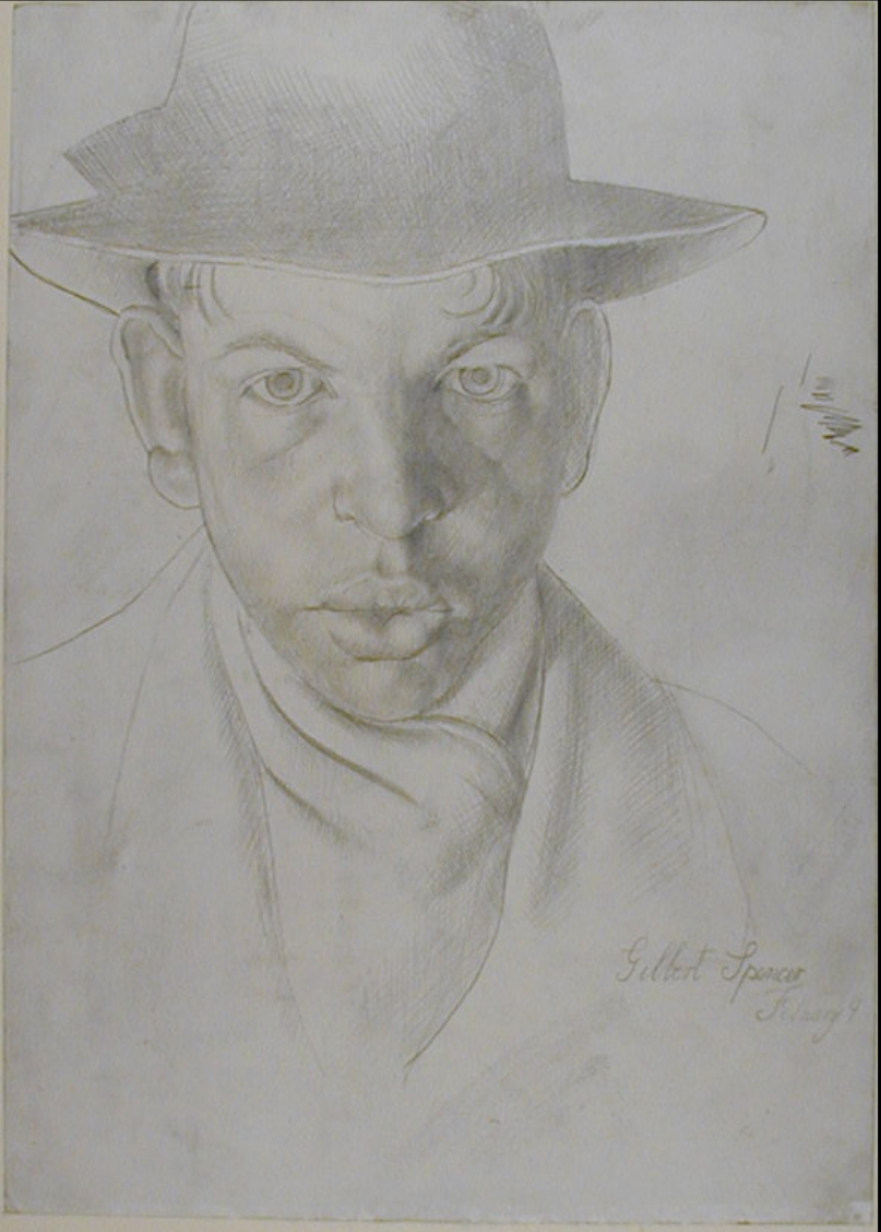 We see Gilbert through his own eyes in the oil portraits he painted throughout his career, as well as numerous self-portrait pencil drawings. The earliest recorded, painted in 1911, is untraced, but Gilbert’s self-portrait of 1914 (Potteries Museum, Stoke on Trent) shows an uncertain young man who is only just emerging as an artist. Its full-frontal format is derived from his brother Stanley’s self-portrait, completed in July that year. But the jaunty pose of Gilbert’s self-portrait of 1928 (Tate) indicates a confident young man who has established himself socially and professionally. This self-confidence matured into the wry humour of Activity at Tree Cottage no. 2 (1967, Royal Academy of Arts), with its euphemistic title, and grand full-length pose at odds with its diminutive size. Gilbert quizzically raises an eyebrow, perhaps in reaction to his art-establishment status. Later that year, the Royal Academy would elect him a Senior Academician, and purchase the self-portrait for its collection.